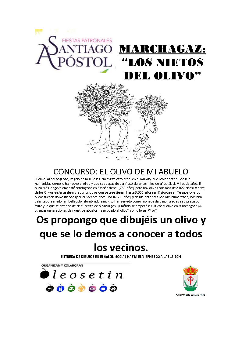 El olivo: Árbol Sagrado, Regalo de los Dioses. No existe otro árbol en el mundo, que haya contribuido a la humanidad como lo ha hecho el olivo y que sea capaz de dar fruto durante miles de años. Si, si, Miles de años. El olivo más longevo que está catalogado en España tiene 1,750 años, pero hay olivos con más de 2.022 años (Monte de los Olivos en Jerusalén) y algunos otros que se cree tienen hasta 5.000 años (en Cisjordania). Se sabe que los olivos fueron domesticados por el hombre hace unos 6.500 años, y desde entonces nos han alimentado, nos han calentado, sanado, embellecido, alumbrado e incluso han servido como moneda de pago, gracias a su preciado fruto y lo que se obtiene de él: el aceite de oliva virgen. ¿Cuándo se empezó a cultivar el olivo en Marchagaz? ¿A cuántas generaciones de nuestros abuelos ha ayudado el olivo? Yo no lo sé. ¿Y tú?